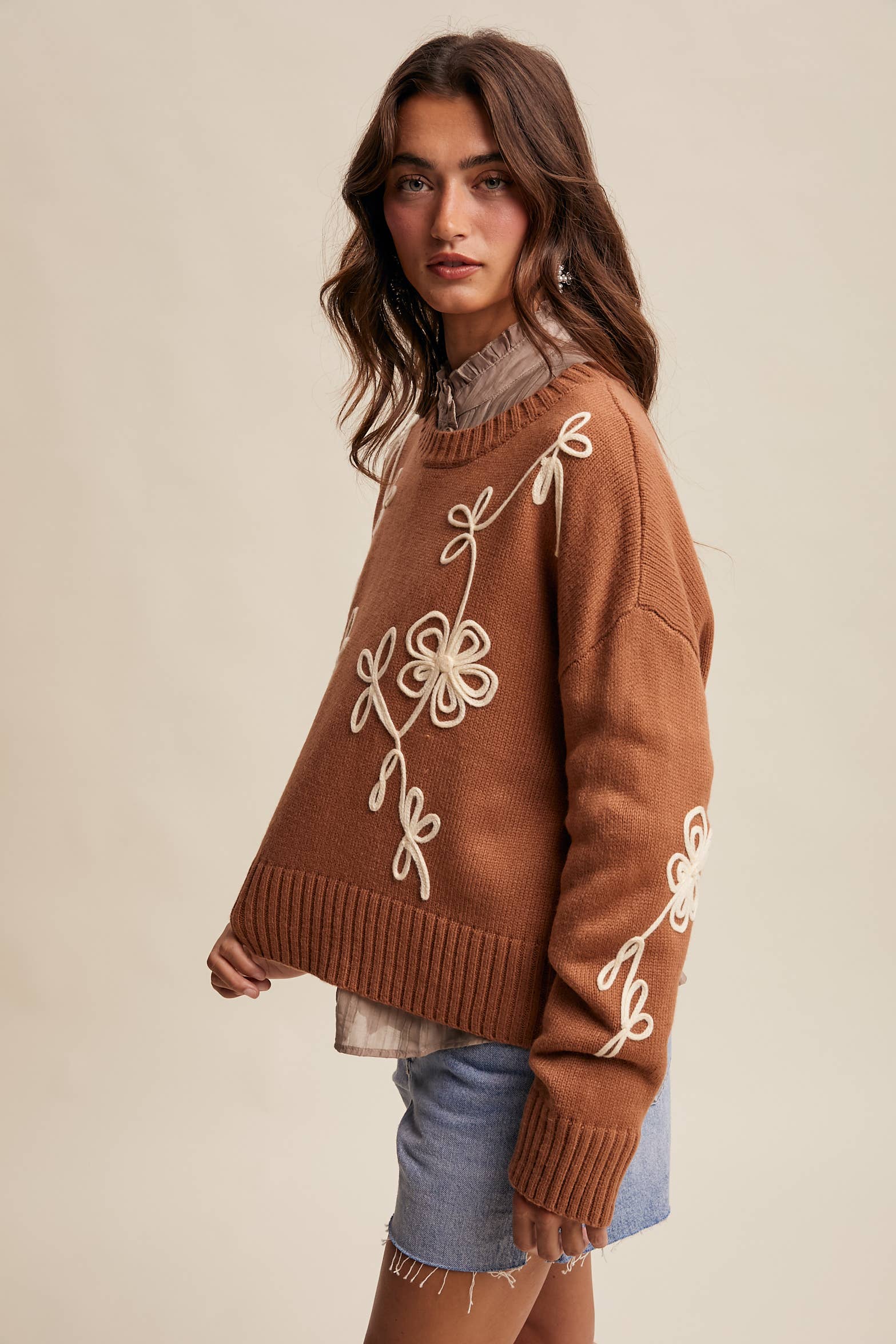 - Soft Knit Fabric: Cozy medium-weight knit offers warmth with breathable comfort - Embroidered Floral Motifs: 3D looped embroidery creates a playful, textured flower design across the front and sleeves - Relaxed Silhouette: Slightly boxy cut with dropped shoulders for an easy, effortless fit - Ribbed Trim: Chunky ribbed neckline, cuffs, and hem add structure and shape - Long Sleeves: Full-length sleeves with embroidered detailing for added charm - Pullover Style: Simple slip-on design makes it perfect for layering