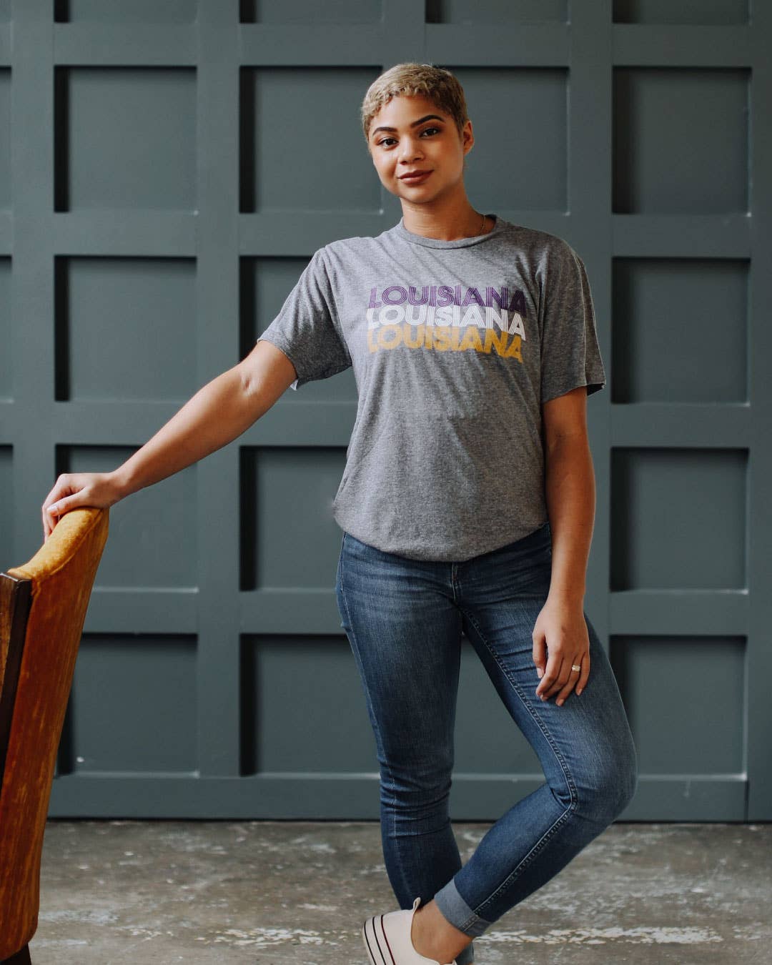 Our Louisiana Inline tee design features our purple and yellow graphic retro Louisiana on our new soft heather grey t-shirt and perfect for Mardi Gras.